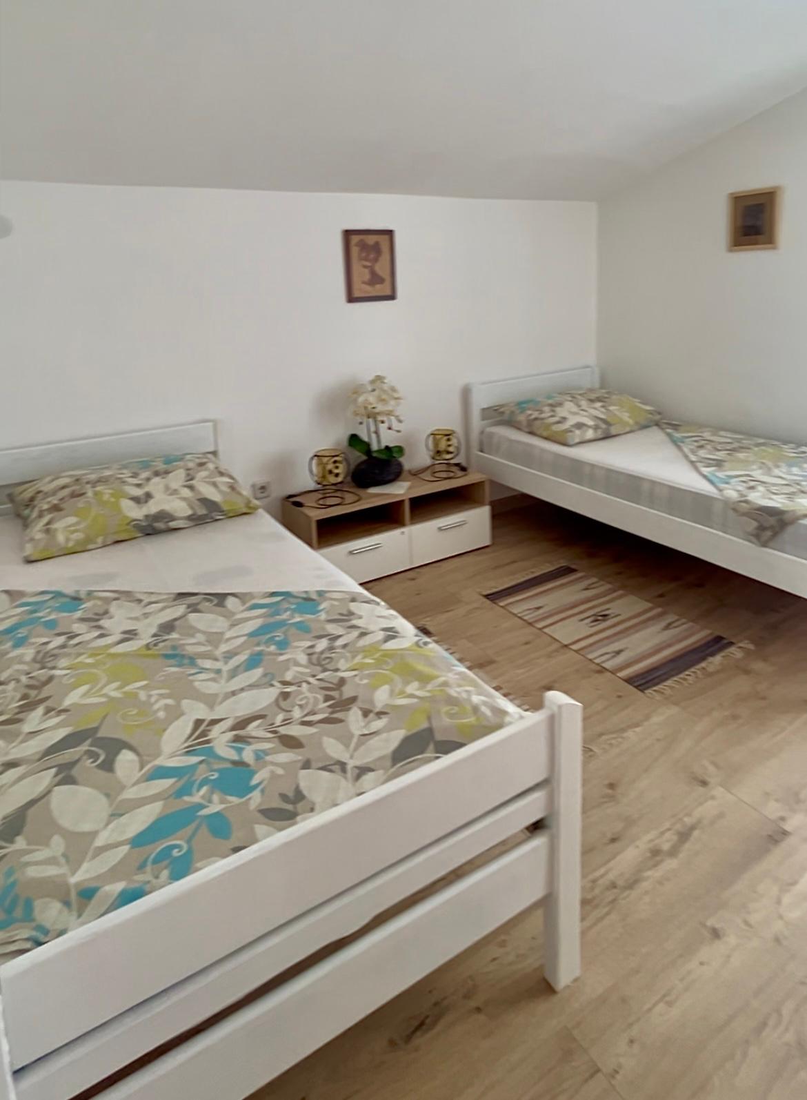 Felső szinten lévő apartman, mely két hálószobával (1db franciaágy, 2db egyszemélyes ágy) és egy nappalival (kanapé) rendelkezik. Négy személy fér el kényelmesen. A hátsó teraszról enyhe rálátás a tengerre.
