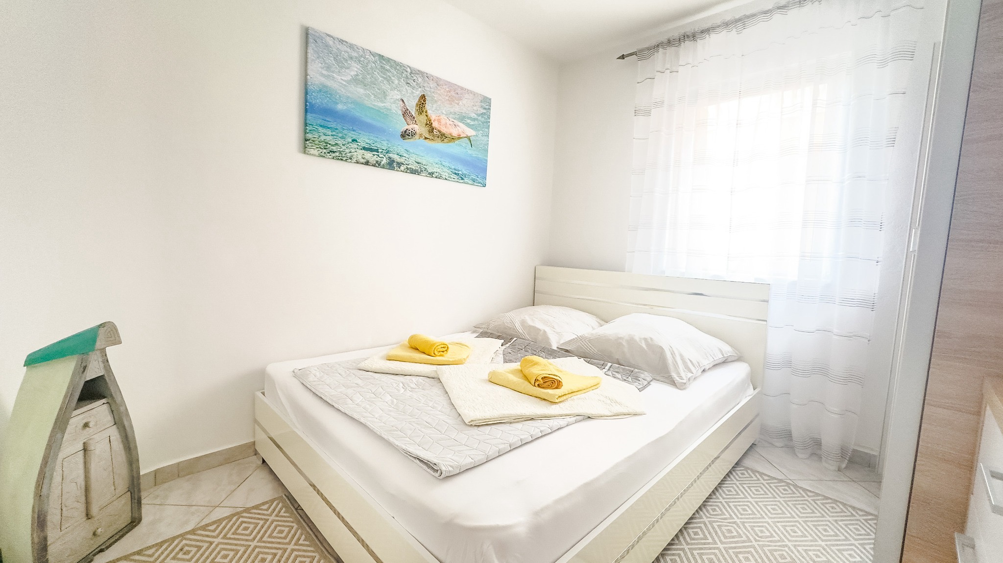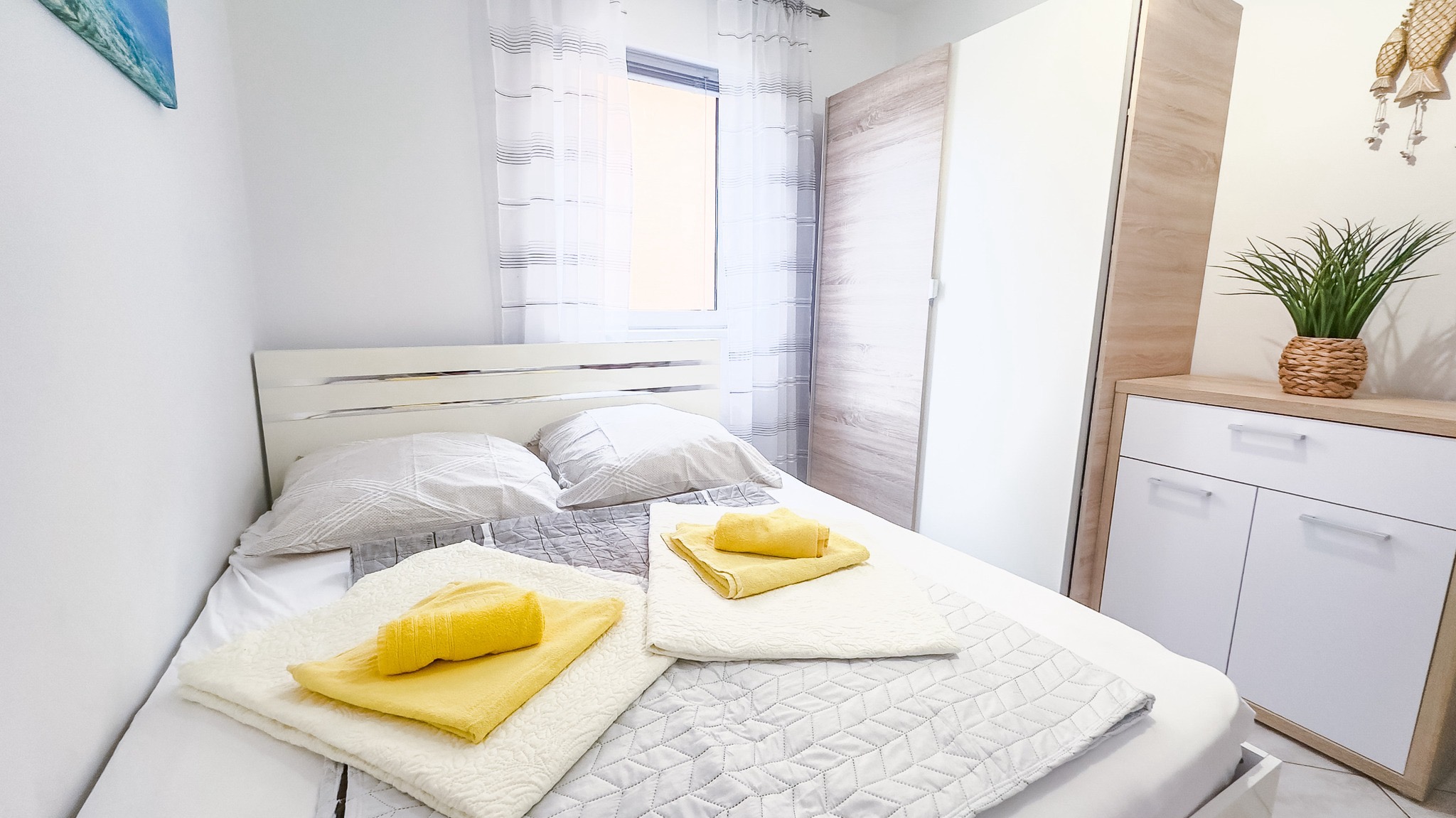 Felszereltség: klíma, tv, rádió, hűtő fagyasztó résszel, vízforraló, konyhai edények evőeszközök, főzőlap/sütő, zuhanyzó, ágynemű, törölköző, vasaló, hajszárító