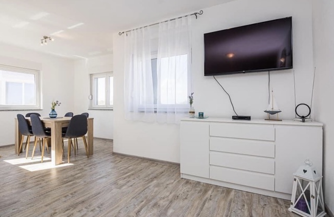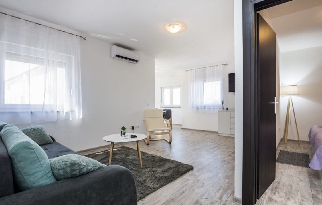 Új építésű modern apartman a belvárosban, Vir sziget déli oldalán található. A Jadró strand 10 perc séta, a központ és a bazársor 400 méterre található. Az épület felső szintjén két nagy apartman foglalható. 2x5 fő részére alkalmas. A közelben minden megtalálható és elérhető gyalogosan. Éttermek, pékség, élelmiszerbolt, gyógyszertár.