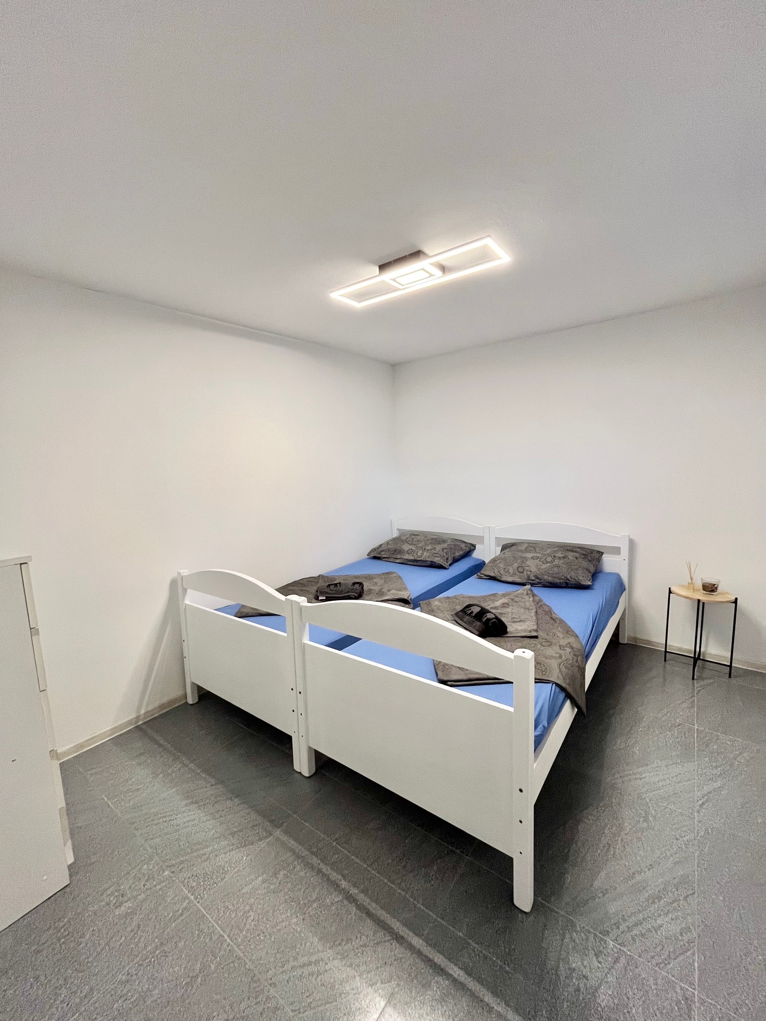 Egy hálószoba (két db egyszemélyes ágy) nappali (kanapé, de nem ágyazható) konyha+étkező, fürdő + wc