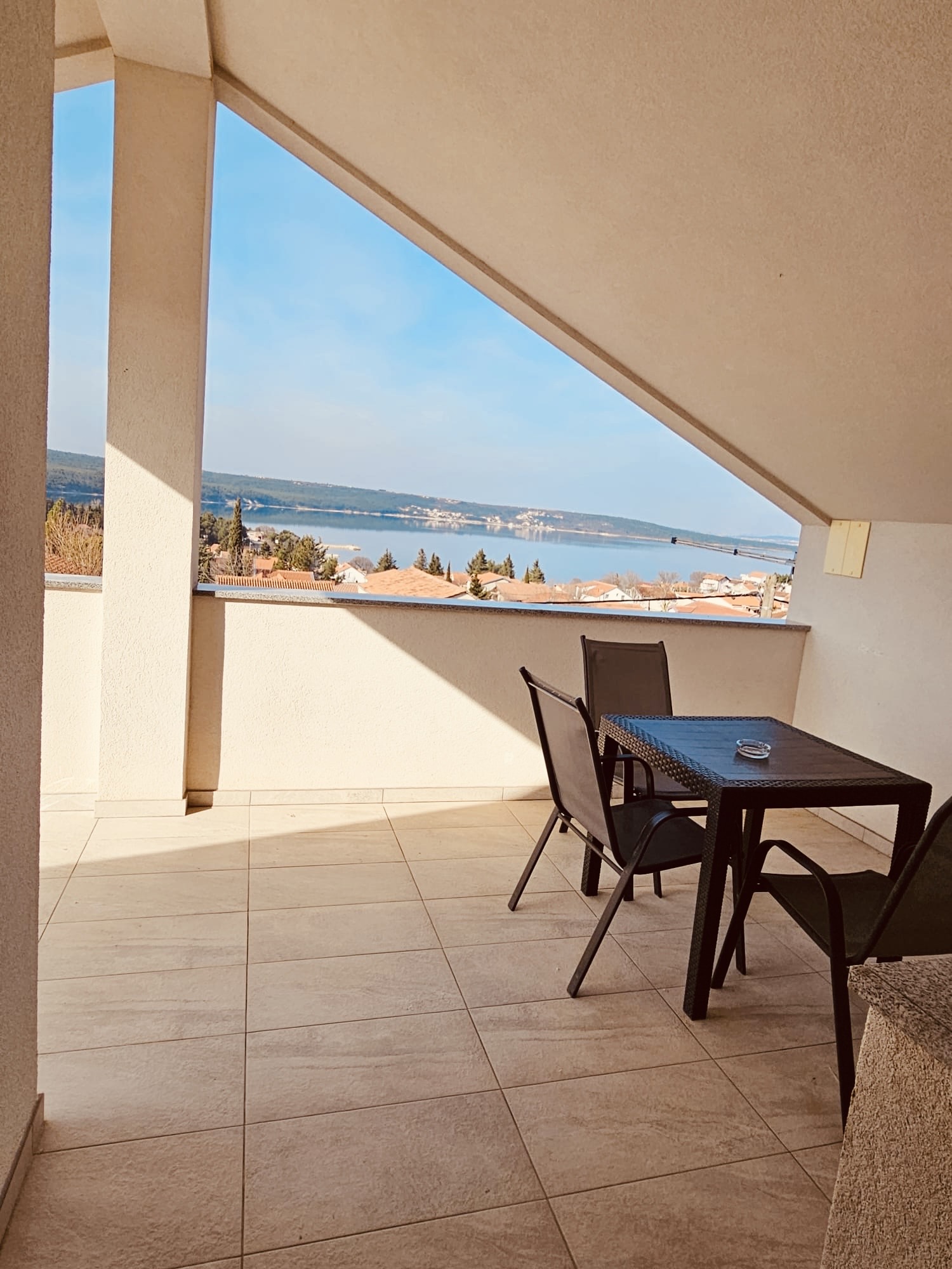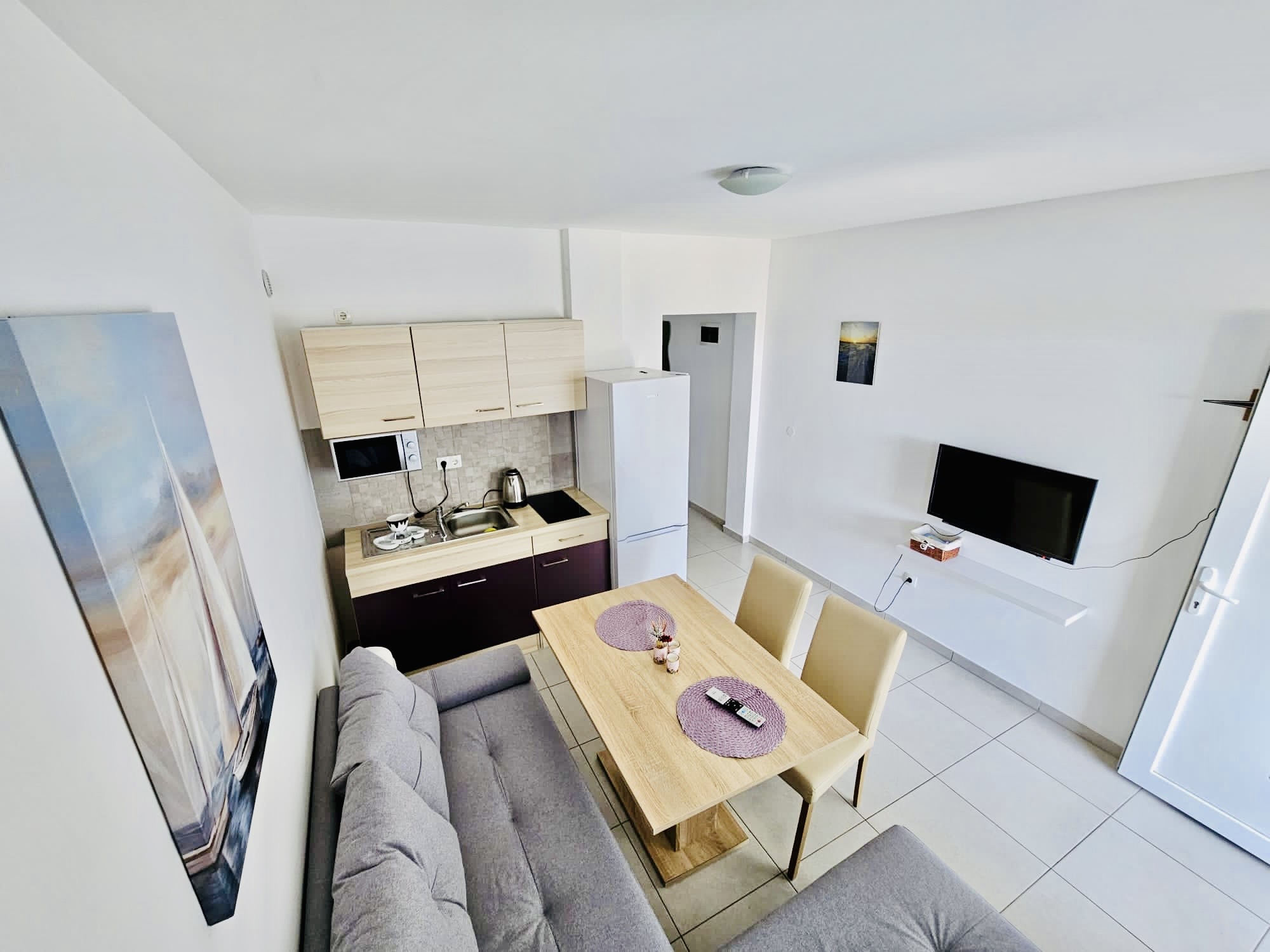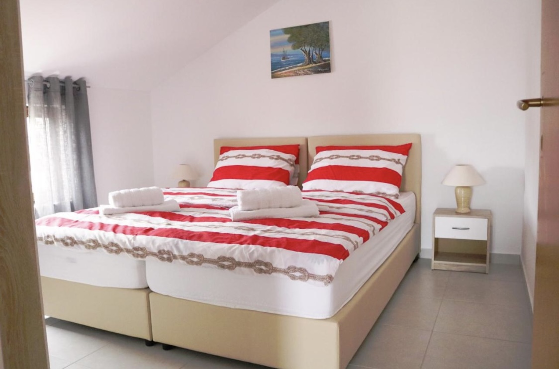Az A1-es apartman az épület felső szintjén helyezkedik el. Egy hálószoba (2 db egyszemélyes ágy, ami összekapcsolható, hogy ne csússzon szét, így franciaággyá alakítható) és nappali (sarokülőgarnitúra, ami kihúzható). A fedett teraszról fantasztikus kilátás nyílik az öbölre. Itt a terasz nincs elszeparálva, a másik apartman terasza pár méter távolságra van.