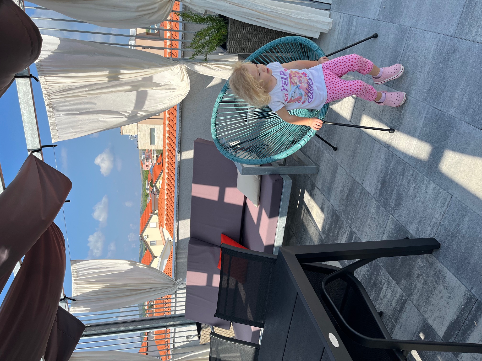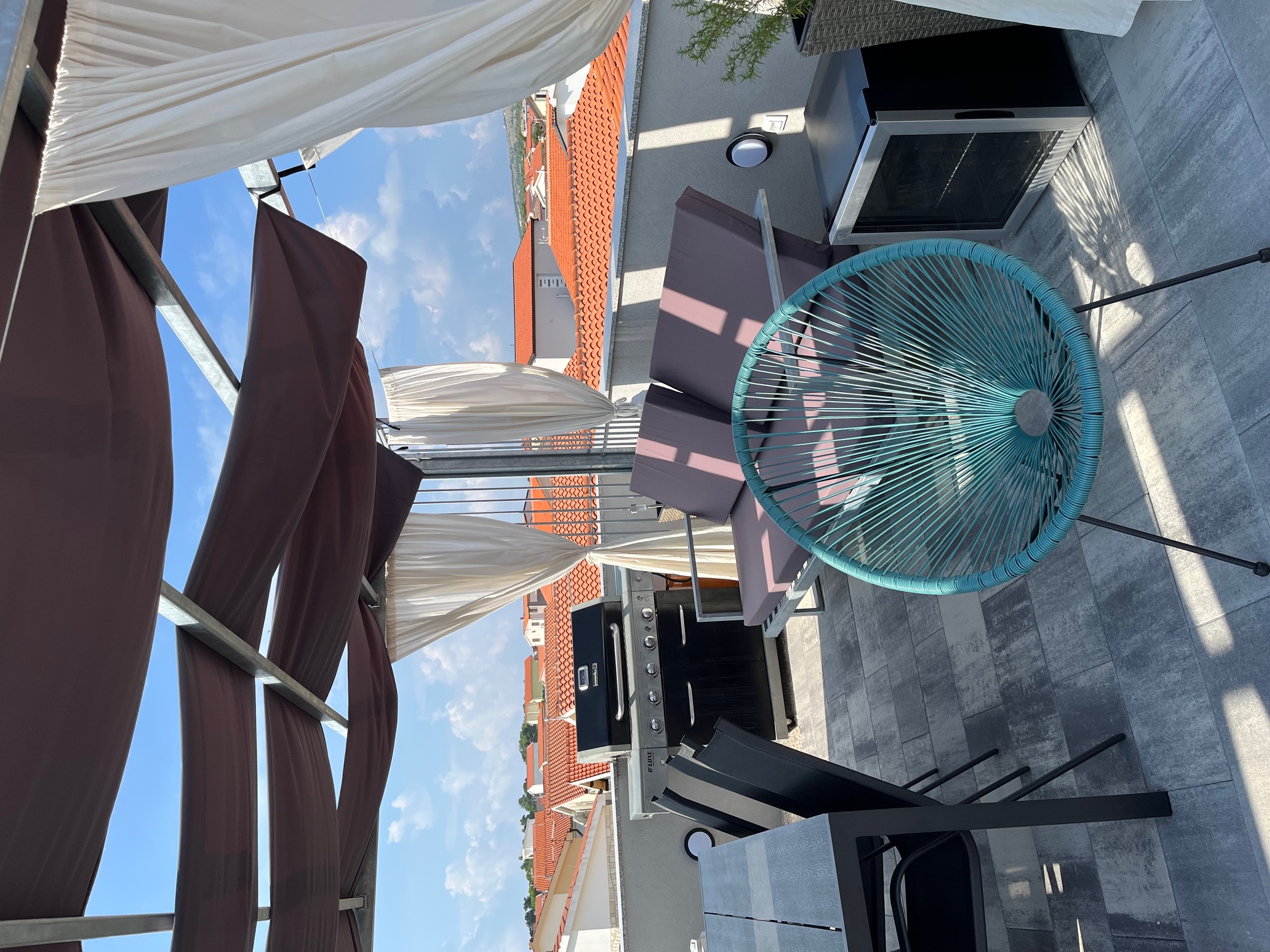 Két apartman található a felső szinten, a tetőteraszt mindkét apartman vendégei használhatják közösen. A saját terasz elszeparált, kilátással a tengerre.