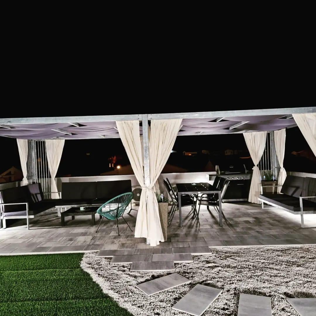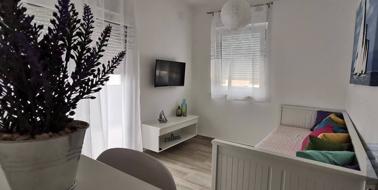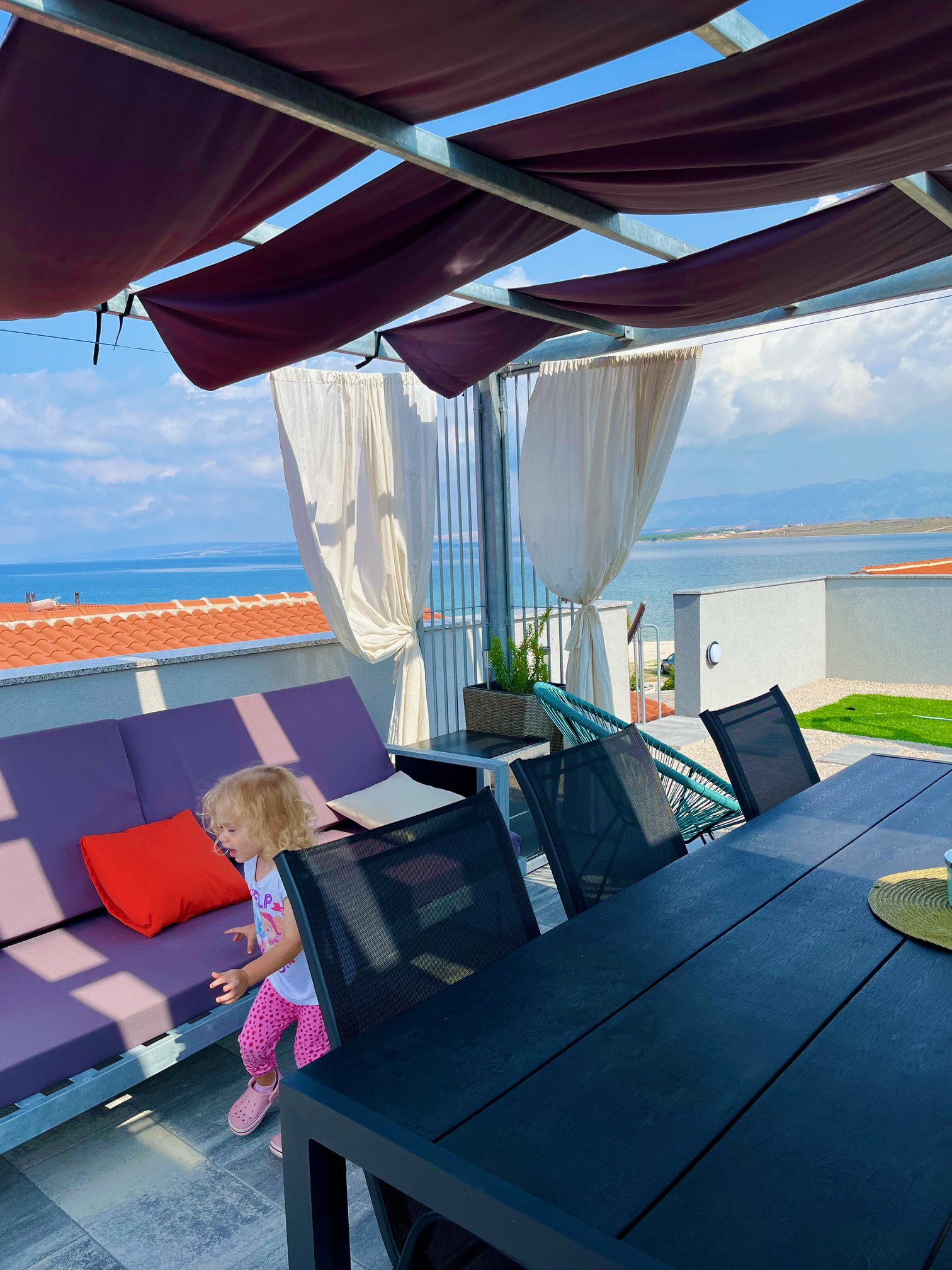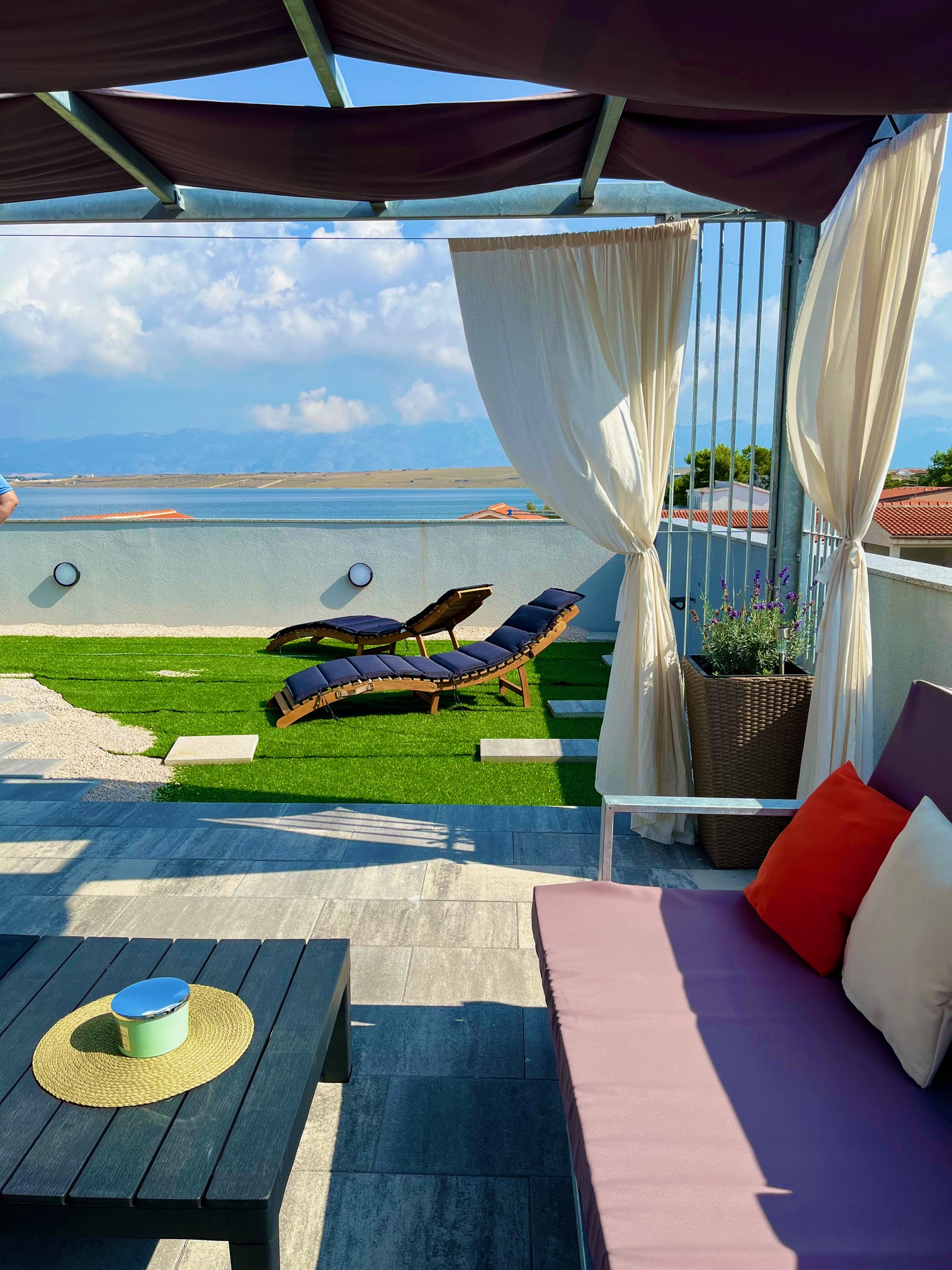 FENTRŐL CSODÁS A TENGER! Napozz a tetőteraszon és csodáld meg a tengert és a hegyeket! TENGERRE NÉZŐ ERKÉLY! Ha szereted a hangulatos új dizájnt, ez az apartman tökéletes választás. Modern, igényes apartman Vir sziget központi részén, egy csendes utcában helyezkedik el, ahonnan pár perc sétára minden elérhető (élelmiszerbolt 300 m, pékség 100 m, fagyizó 100 m, éttermek és tengerpart 60 m). A városközpont, a bazársor 15 perc séta, ahol esténként szórakoztató programok, koncertek és éttermek, koktélbárok találhatók.