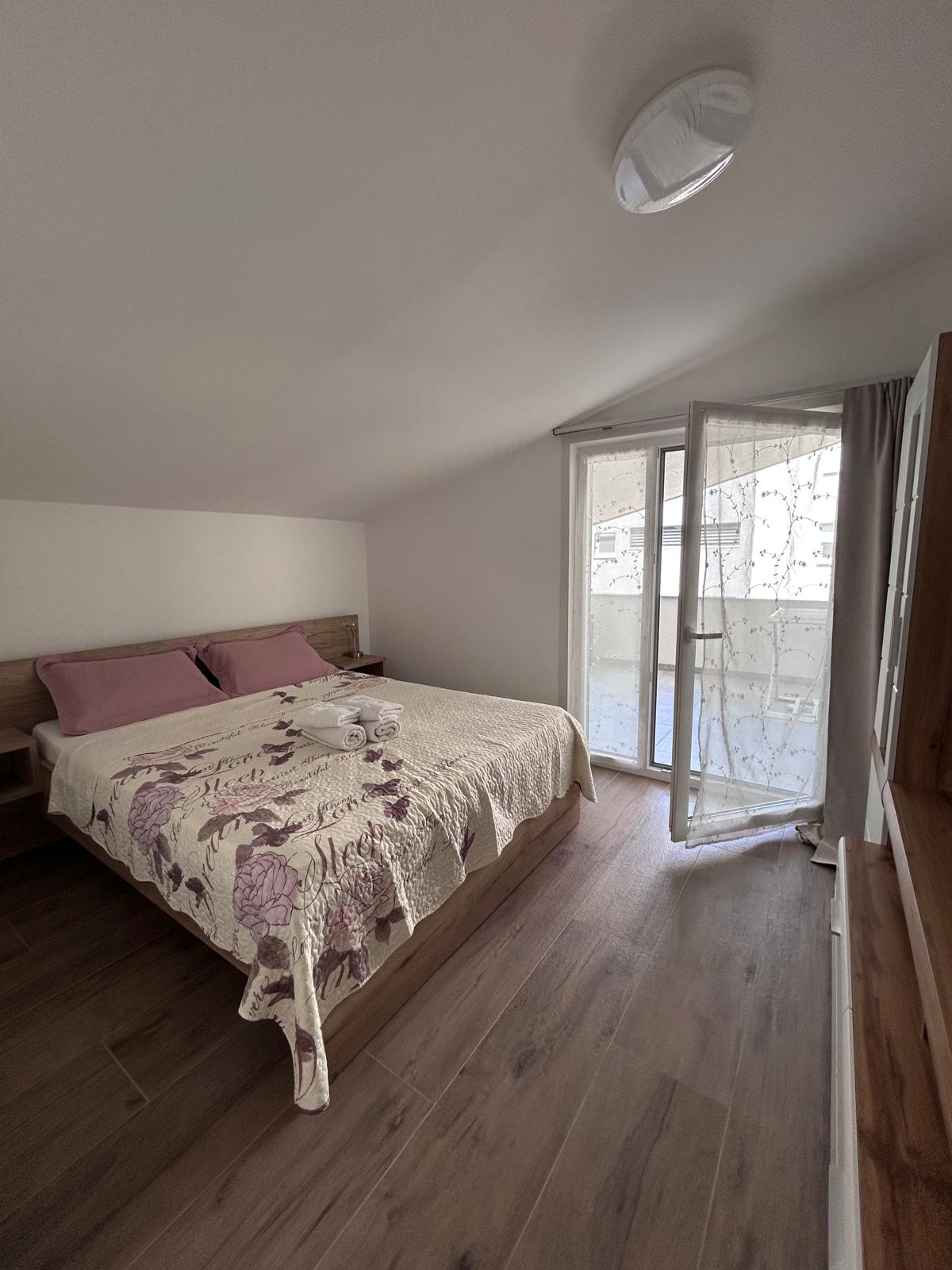 Az apartman a felső szinten helyezkedik el, ahol egy franciágyas hálószoba és konyha található. A hálószobában egy kisebb gyerek (maximum 5 éves) pótágyon tud aludni. A fedett teraszról itt fantasztikus a kilátás a tengerre. Az udvarban a grill közös a másik apartmannal. Teljesen új fürdőszoba, konyha, és bútorok.